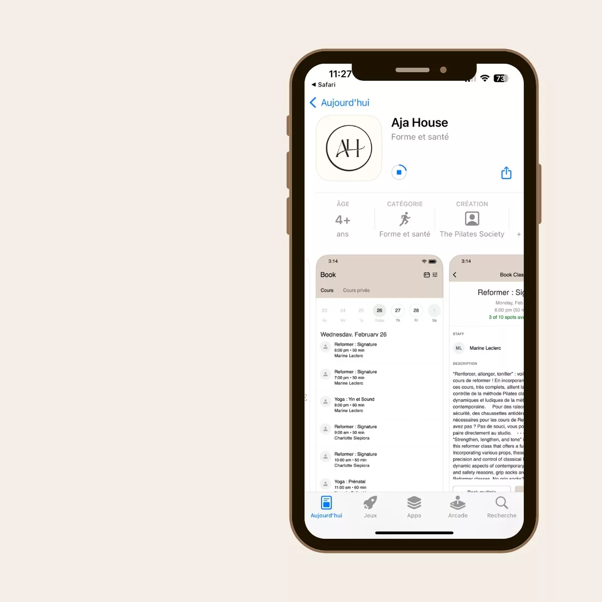 Téléchargez gratuitement l’application Aja House et accédez à tous nos cours et ateliers de Pilates, barre, fitness et bien-être, où que vous soyez.